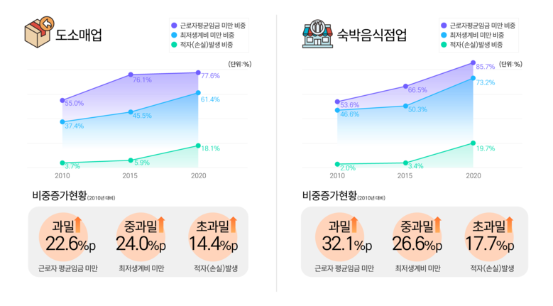 핵심 수치로는 2020년 기준 도소매업의 평균 영업이익은 2,520만원으로 근로자 평균임금 미만 사업체 77.6%, 최저생계비 미만 61.4%, 손실 발생 18.1%로 나타났으며, 숙박음식점업의 평균 영업이익은 1,000만원으로 근로자 평균임금 미만 사업체 85.7%, 최저생계비 미만 73.2%, 손실 발생 19.7%로 나타나 도소매업보다 더 취약한 양상을 보였다.