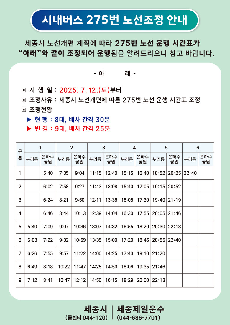 한편, 변경된 노선에 대한 자세한 내용은 시 누리집(sejong.go.kr)에서 확인할 수 있다.