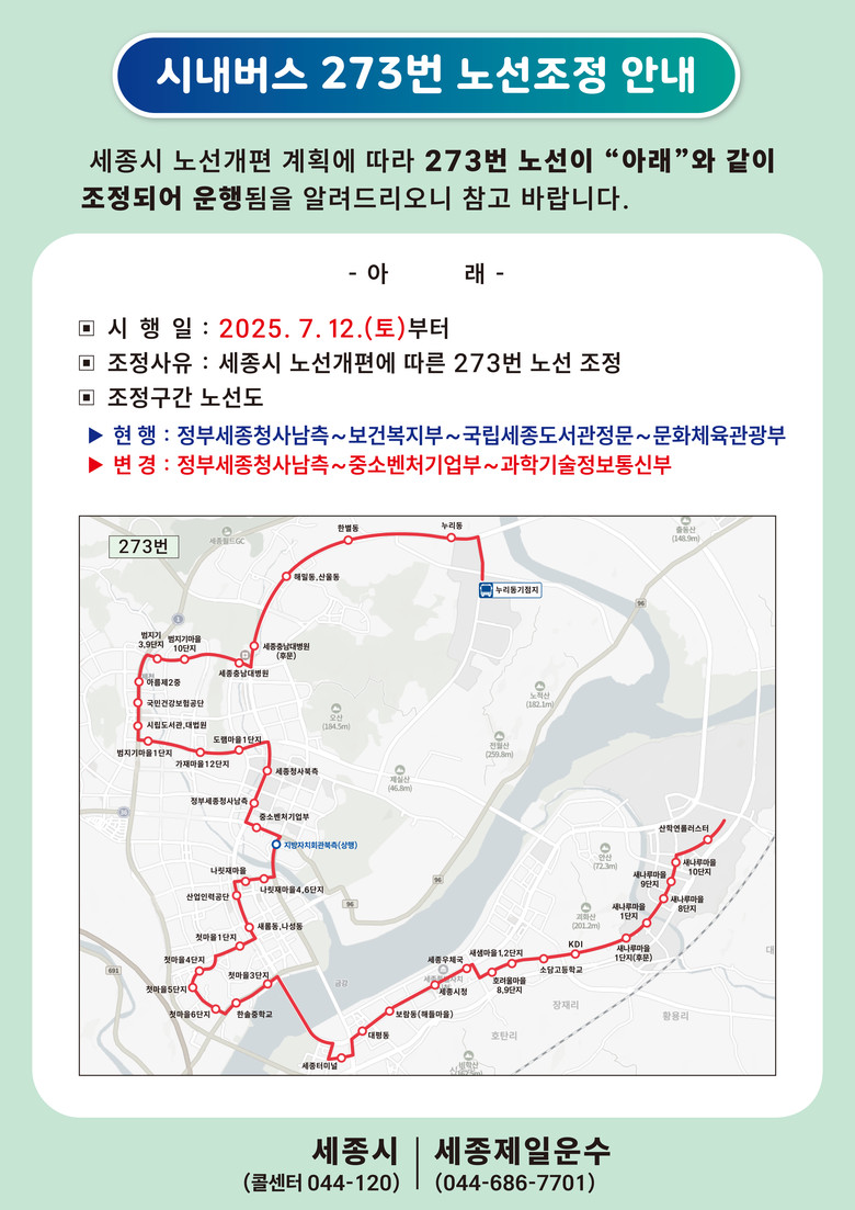 이에 시는 201번을 어진동 방향으로 우회하고, 273번은 중소벤처기업부를 경유하도록 조정해 유턴 구간을 제거했다.