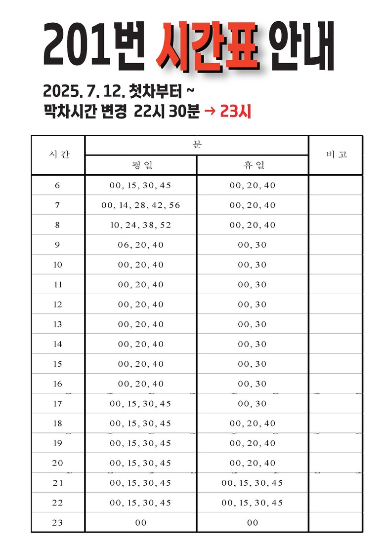 이외에도 시는 시민들의 편의성 확보를 위해 201번의 막차시간을 기존 오후 10시 30분에서 11시로 연장했고, 275번의 배차 간격을 30분에서 25분으로 줄이는 등 노선 운행 시간표를 조정했다.