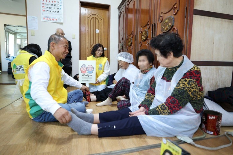 지난 6일 신천지자원봉사단 전주지부 회원들이 발 건강 관리 하며 말벗을 나누고 있다.