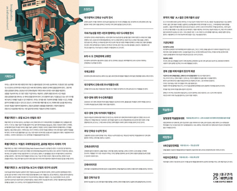 초청전시에서는 ‘2025 대구광역시 건축상’ 수상작, ‘대구건축 아카데미’ 작품, ‘대구건축사회 우수작품’ 등이 소개된다. 젊은 건축가들의 후적지 개발 아이디어도 전시돼 창의적인 도시공간 활용 방안을 제시한다.
