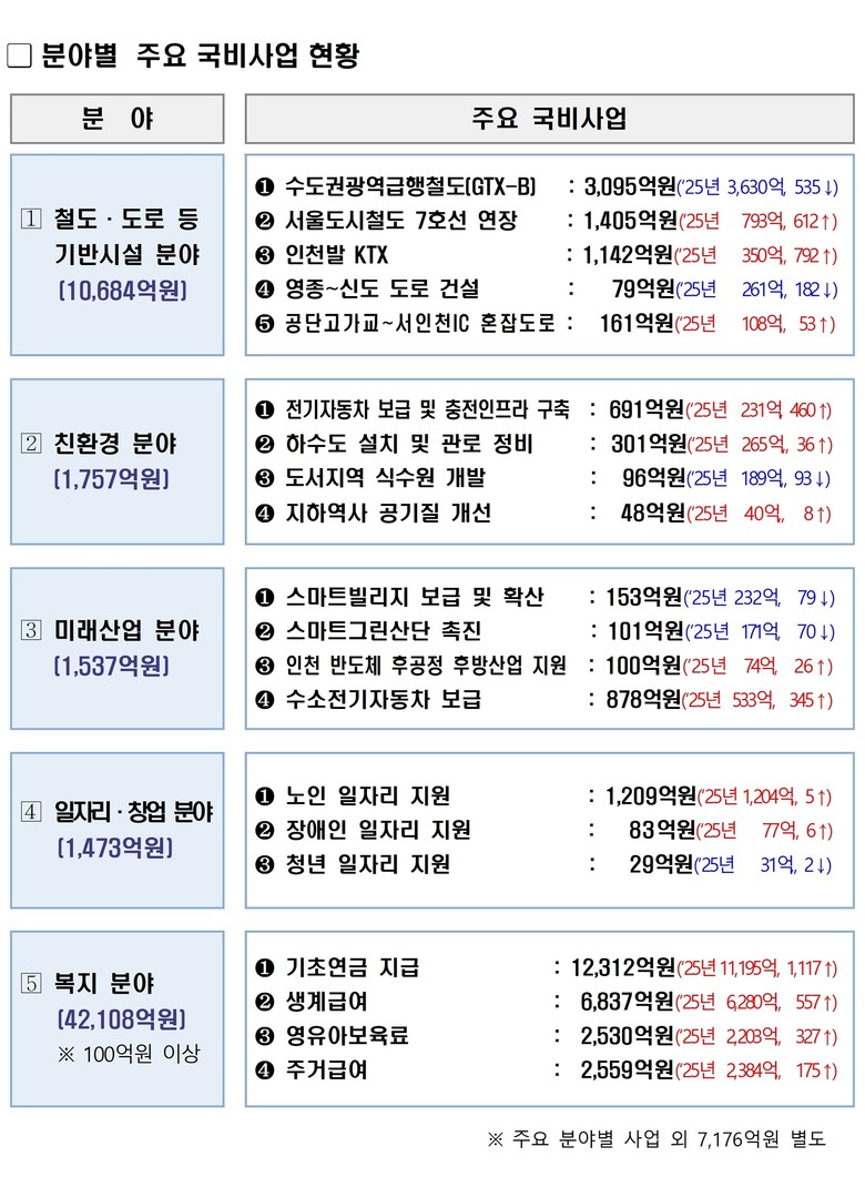 분야별 반영 규모는 ▲미래산업 1,537억 원, ▲철도·도로 기반시설 10,684억 원, ▲친환경 1,757억 원, ▲일자리·창업 1,473억 원, ▲복지 42,108억 원이다.