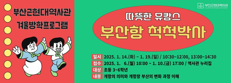 [부산 세계타임즈=이용우 기자] 부산근현대역사관(이하 역사관)은 오는 1월 14일부터 19일까지 역사관에서 초등학생 3~6학년을 대상으로 겨울방학 프로그램 <따뜻한 뮤캉스>를 운영한다고 밝혔다.