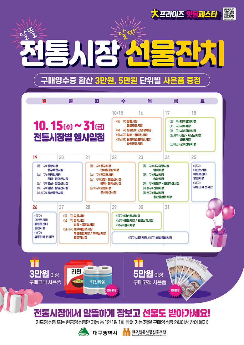 행사는 시장별로 이틀간 진행된다. 당일 구매 영수증 합산 금액이 3만 원 이상일 경우 라면 또는 키친타올을, 5만 원 이상일 경우 온누리상품권 1만 원을 선착순으로 증정한다. 시장별 세부 행사 일정은 대구시 홈페이지(www.daegu.go.kr) 또는 대구전통시장진흥재단 블로그(blog.naver.com/dmarket100)를 통해 확인 가능하다.