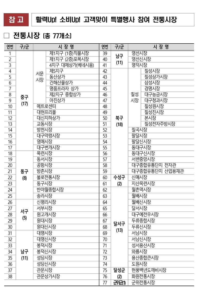▸ ‘대구로’ 앱 온누리상품권 결제 시 20% 즉시 할인 재개(10.20.~31.) [대구 세계타임즈=한윤석 기자] 대구광역시는 10월 15일부터 31일까지 지역 내 전통시장 77곳에서 ‘전통시장 활력UP! 소비UP! 고객맞이 특별 사은행사’를 진행한다.