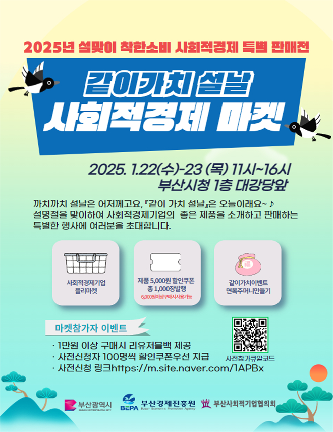 ◈ 사회적경제기업 제품 판매촉진을 통한 지역경제 활성화 및 지역주민과 사회적경제기업 간 소통 증진 기대 [부산 세계타임즈=이용우 기자] 부산시(시장 박형준)는 오늘(22일)부터 이틀간 시청 1층 로비에서 「2025년 설맞이 사회적경제 플리마켓」을 개최한다고 밝혔다.