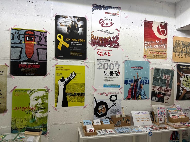2층은 그리 넓지 않은 공간을 다양한 전시로 빼곡하게 채웠다. 저항과 진보의 민주노총 30년을 상징하는 '불' 전시, 민주노총 이전 투쟁사를 전시한 '비하인드 민주노총', 안전모·분진마스크·월급명세서 등 생활사를 보여주는 '노동자의 방' 등이 알찬 내용으로 시민들을 맞고 있다.