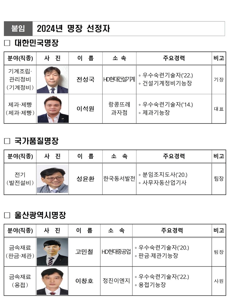 올해의 경우 전국 총 13명(13개 직종)이 선정된 가운데 울산에서는 전성국 기장(에이치디(HD)현대건설기계)과 이석원 대표(랑콩뜨레과자점) 등 2명이 선정됐다.