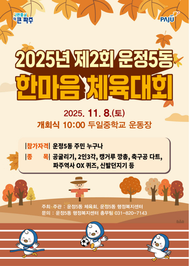 [파주시 세계타임즈=송민수 기자] 파주시 운정5동은 오는 11월 8일 토요일 두일중학교에서 ‘2025년 제2회 한마음 체육대회’를 개최한다.