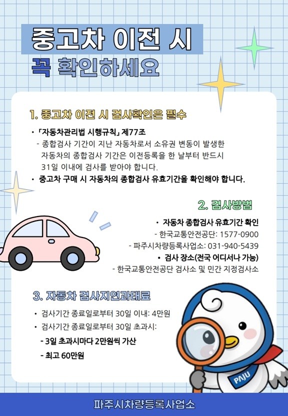 이호명 파주시 차량등록사업소장은 “자동차의 안전과 환경을 지키기 위한 종합검사는 선택이 아닌 의무”라며, “중고차 이전 후 31일 이내에 반드시 검사를 받아 불이익을 받지 않도록 시민 여러분의 적극적인 협조를 부탁드린다”라고 말했다.