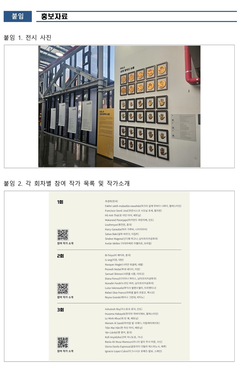 이번 전시는 인천문화재단이 2010년부터 2013년까지 총 4회에 걸쳐 인천에서 운영했던 인천 AALA 문학 포럼(아시아·아프리카·라틴아메리카 문학 포럼)에 참여한 작가들의 핸드프린팅을 전시하여, 국제 문학 교류의 장으로서 인천의 문학적 위상을 다시금 조명하고자 기획되었다. 전시에서는 2010년 제1회, 2011년 제2회, 2012년 제3회 포럼에 참여한 총 30명의 작가 핸드프린팅과 작가별 소개 자료를 함께 만나볼 수 있다. 이를 통해 인천을 찾은 세계적 작가들의 자취와 세계 문학의 다양성을 한눈에 살펴볼 수 있다.