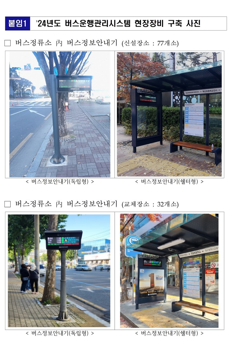 아울러, 노후화로 시인성이 떨어지는 32개소에 버스정보안내기를 교체했다. 그리고 저상버스 측·후면 LED행선판을 각각 63대 설치하고 노후화로 고장이 잦은 전면 LED행선판 84대 및 승객용안내기 82대를 대폭 교체했다.