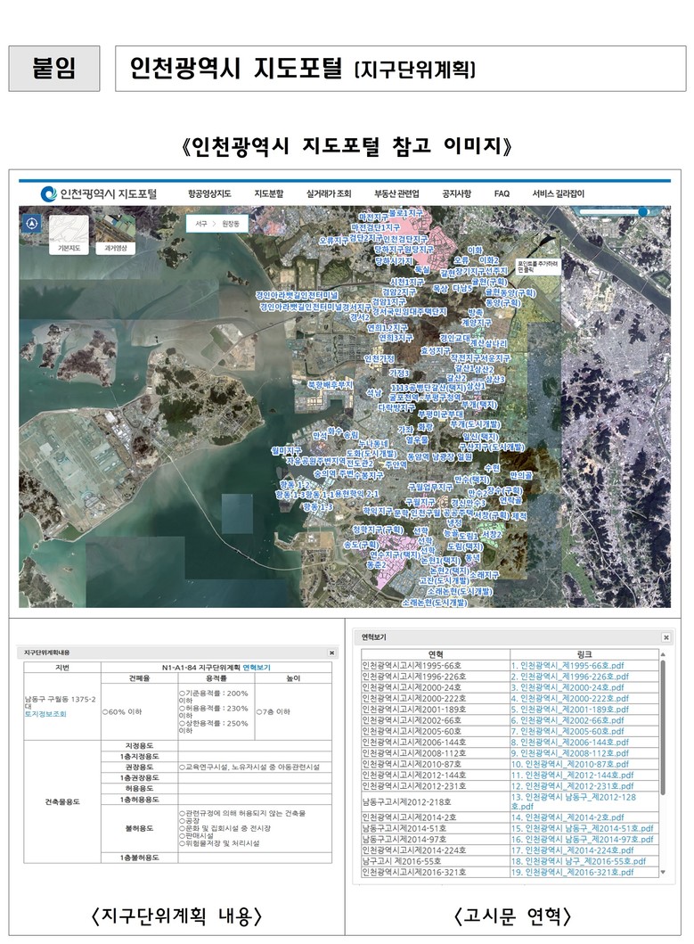 시민은 인천시 지도포털(https://imap.incheon.go.kr/icmap/map.jsp)에 접속해 주소 입력 또는 위치 선택만으로 해당 토지의 지번, 지목, 면적 등 기본정보와 함께 지구단위계획구역, 건축물 용도, 건폐율, 용적률, 높이 등 세부정보를 한눈에 확인할 수 있다. 또한, 각 구역별 고시문 다운로드 기능도 제공된다.