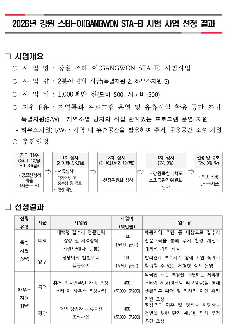 [강원도 세계타임즈=김민석 기자] 강원특별자치도는 인구감소와 고령화로 인한 지역소멸 위기에 선제적으로 대응하기 위해 추진한 2026년 「강원 스테-이(GANGWON STA-E) 사업」 공모 결과, 2개 분야 4개 시군을 최종 선정했다.