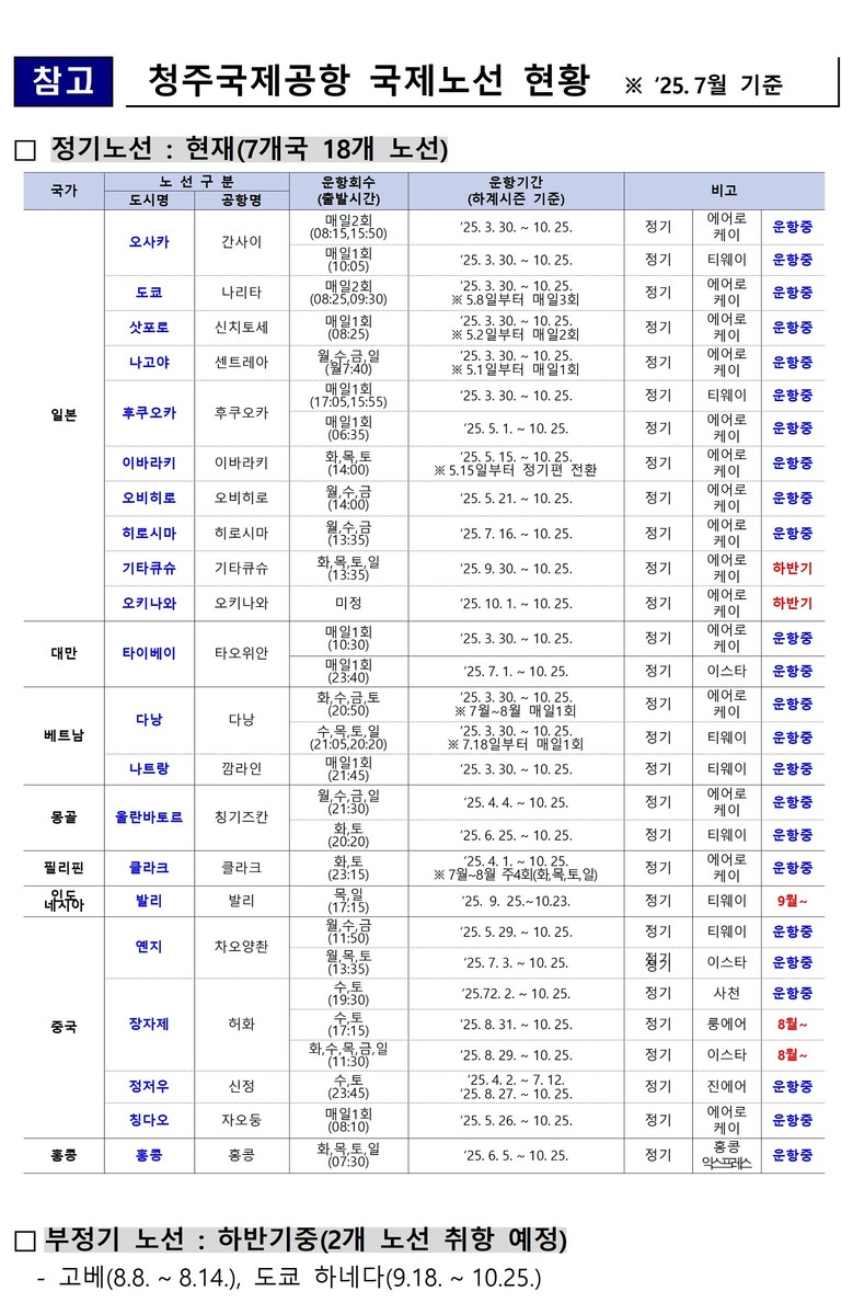 그동안 일본 중소도시 방문을 위해 인천까지 이동해야만 했던 지역 주민의 불편(시간, 비용 등)이 개선되고 편의가 향상될 것으로 기대된다. 에어로케이항공은 하반기 중에 기타큐슈(9월 30일~), 오키나와(10월 1일~) 등 노선을 확장하며 충북도민 등에게 다채로운 여행의 기회를 제공한다는 계획이다.