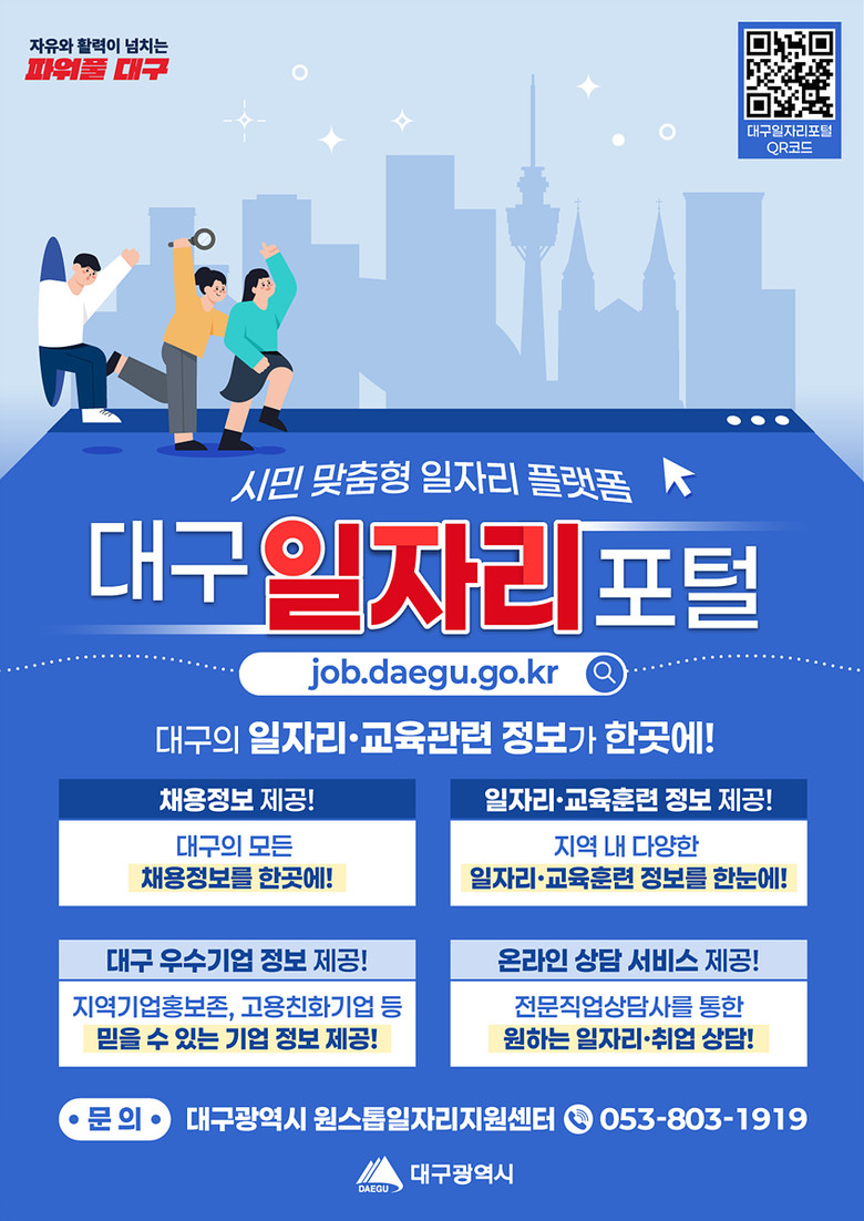 대구일자리포털은 ‘시민 맞춤형 일자리 플랫폼’을 슬로건으로 지역 내 일자리, 교육훈련 정보를 제공하고 효율적인 고용지원서비스를 제공하기 위해 2022년 12월 오픈했다.