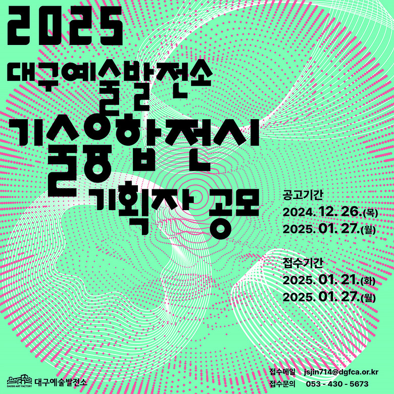 기술융합전시는 2025년 1월 21일(화)부터 1월 27일(월)까지 접수를 한다. 각 사업에 대한 신청 접수는 대구문화예술진흥원 홈페이지 공고(https://dgfca.or.kr/article/NOTICE/list)를 참고해 이메일(jsjin714@dgfca.or.kr)로 접수하면 된다.
