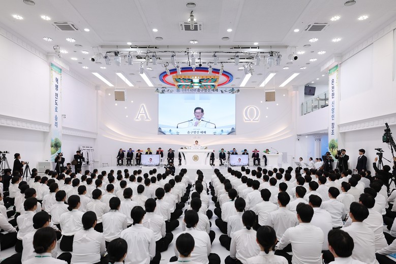 | ▲ 지난 1일 신천지예수교회 바돌로매지파 영등포교회에서 2026년 송구영신 예배가 열린 가운데 이만희 총회장이 올해의 표어(사명 완수의 해)를 선포하고 있다. [사진 제공 = 신천지예수교회] |