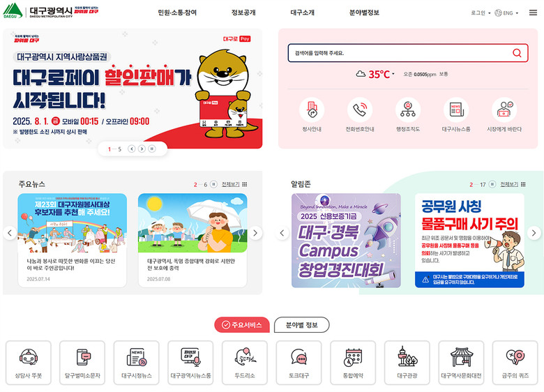 [대구 세계타임즈=한윤석 기자] 대구광역시는 8월 15일(금) 오후 2시부터 16일(토) 오후 2시까지 약 24시간 동안 ‘통합전산센터 전기시설 개선 작업’에 따라 시 대표 홈페이지를 비롯한 대민·행정 서비스 165종이 일시 중단된다고 밝혔다.
