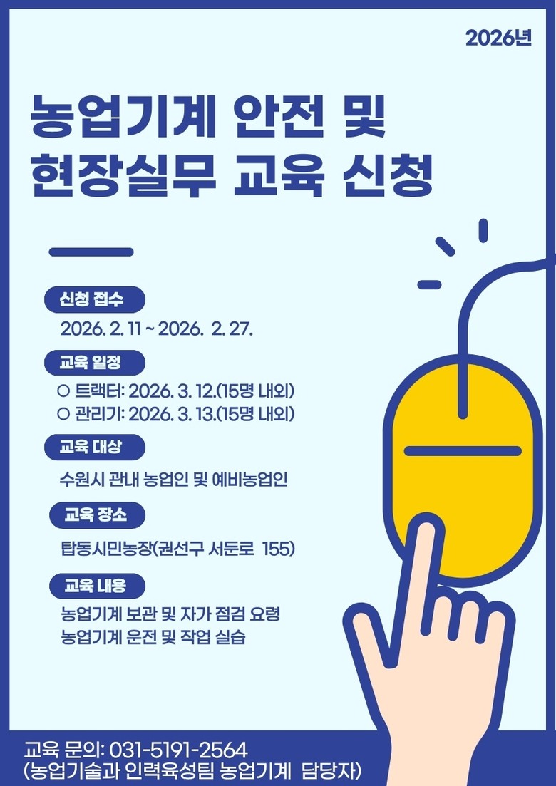 수원시 관계자는 “농업인과 예비농업인이 농업기계를 더 안전하게 다루고, 사고를 예방하는 데 도움이 되길 바란다”며 “앞으로도 농기계 임대, 순회 수리 교육 등 현장 중심 사업을 지속해서 추진하겠다”고 말했다.