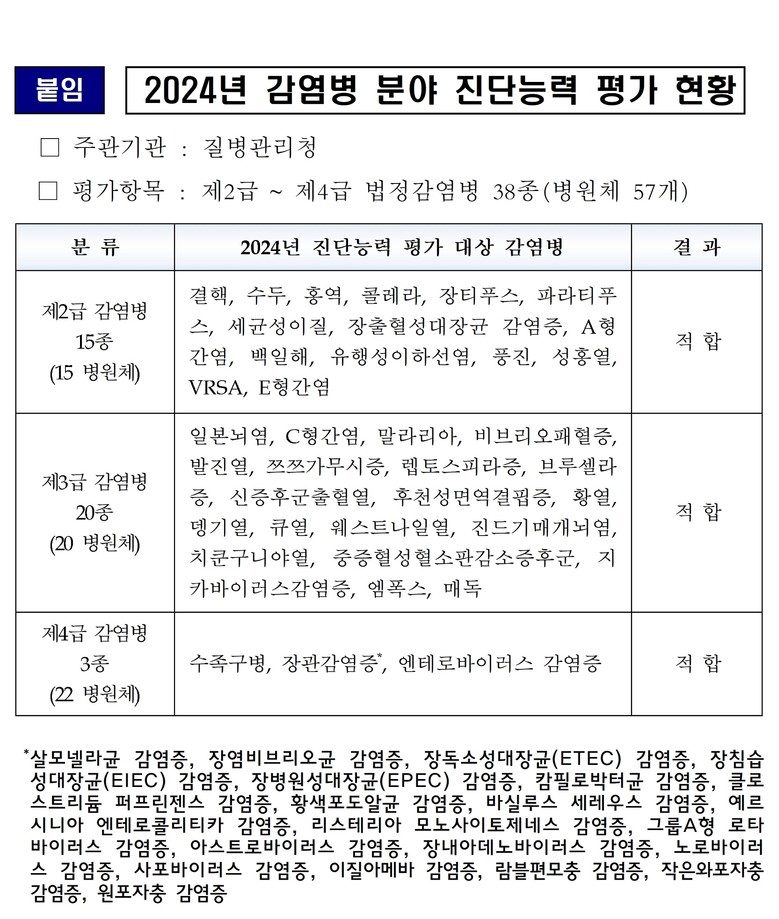 질병관리청은 매년 감염병병원체 확인기관인 전국 시·도 보건환경연구원, 질병대응센터, 보건소, 의료기관 등을 대상으로 감염병 진단검사의 정확성 및 신뢰성 확보를 위한 실험실 진단능력 평가를 실시하고 있다.