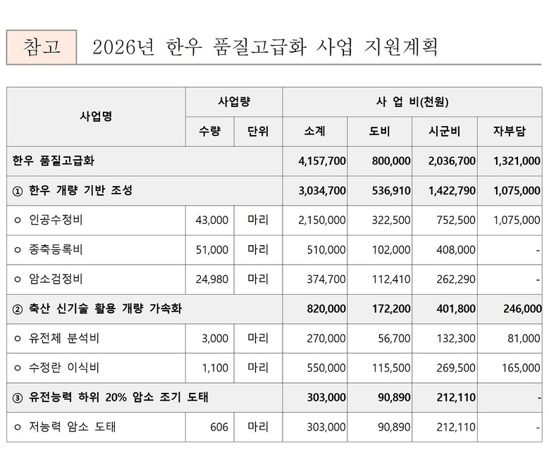 또한 한우 개량 속도 가속화를 위해 유전체 분석과 수정란 이식 등 축산 신기술을 적극 도입·활용하고, 암소검정 및 유전체 분석 결과를 기반으로 유전능력 하위 20% 저능력 암소의 조기 도태를 지원해 개량 효율을 높인다.