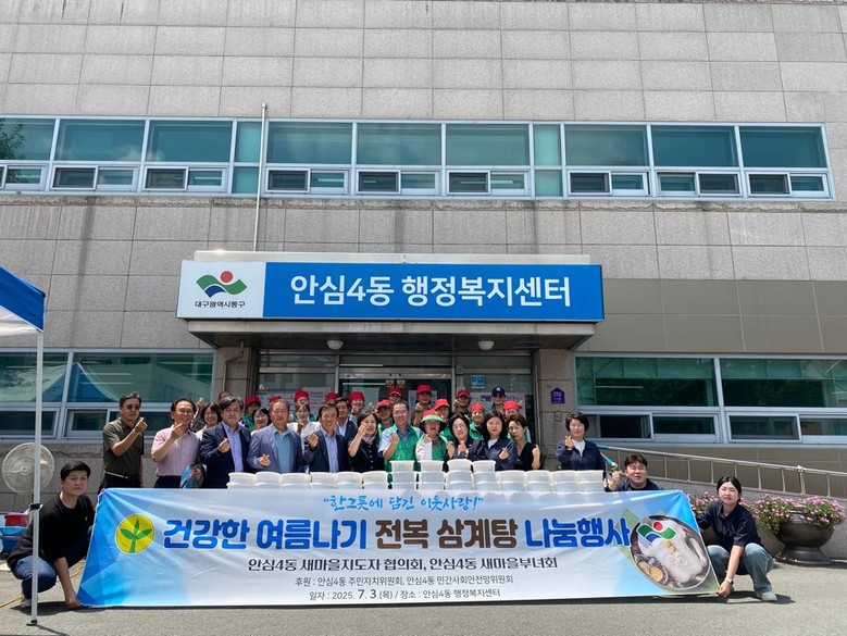 [동구 세계타임즈=한윤석 기자] 대구 동구 안심4동 새마을지도자협의회(회장 권진흠)·새마을부녀회(회장 반미진)는 지난 3일, 폭염 취약계층의 건강한 여름나기를 위해 동 행정복지센터에서 ‘건강한 여름나기 전복삼계탕 나눔 행사’를 개최했다.