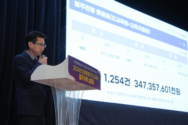 [강원도 세계타임즈=김민석 기자] 강원특별자치도교육청은 23일(금) 원주 치악체육관에서 청렴한 계약문화 확산과 지역경제 상생을 위한 ‘2026년 공사·용역·물품 발주계획 설명회’를 개최했다.