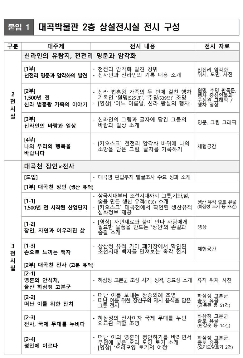 천전리 명문과 암각화를 소개한 2전시실과 대곡댐 편입부지 발굴조사 성과를 소개한 한 3전시실로 구성되어 있다.