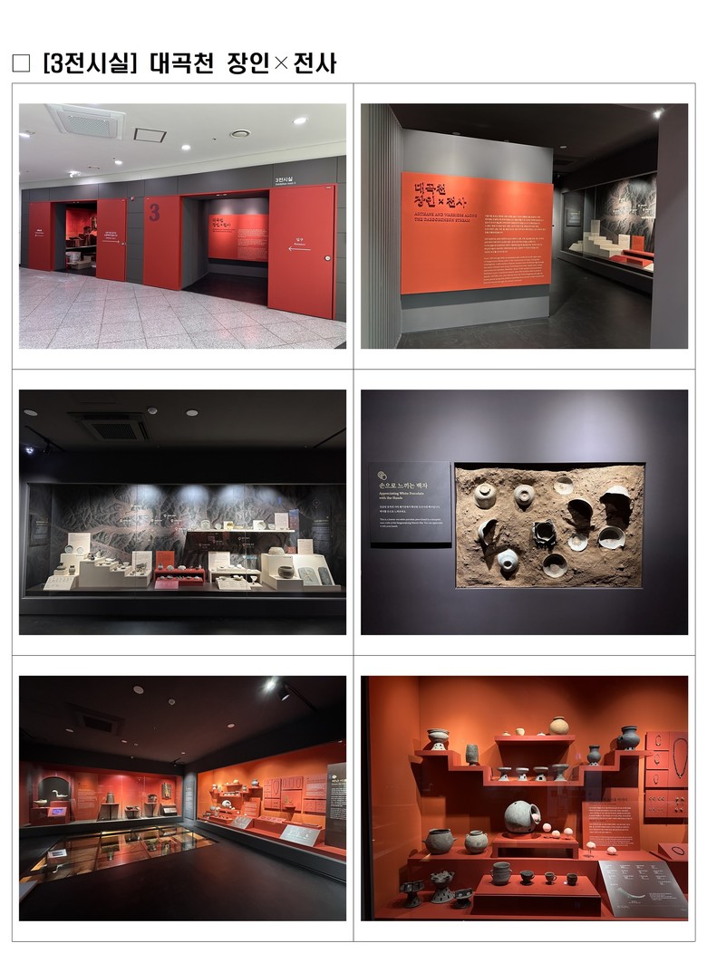 3전시실은 대곡댐 건설을 위해 이루어진 발굴 조사의 주요 성과를 출토 유물을 중심으로 영상, 무인 안내기(키오스크), 촉각 전시물 등 다양한 매체를 활용해 전시 이해와 몰입도를 높였다.