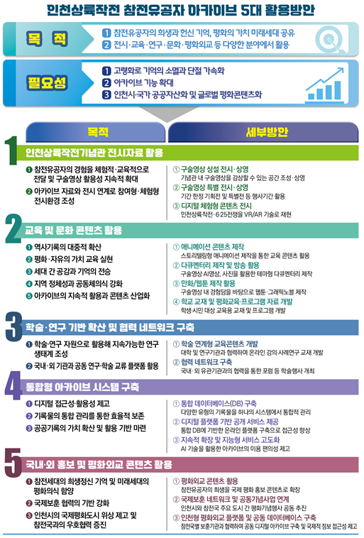 더불어 아카이브 사업의 지속가능성과 확산을 위해 △다년도 사업 전환, △참전·생활사 기록 수집 확대, △‘인천평화안보센터(가칭)’ 설립, △통합형 디지털 플랫폼 구축, △평화·보훈 교육 및 국제협력 활용 등 5대 정책제언도 함께 제시했다.