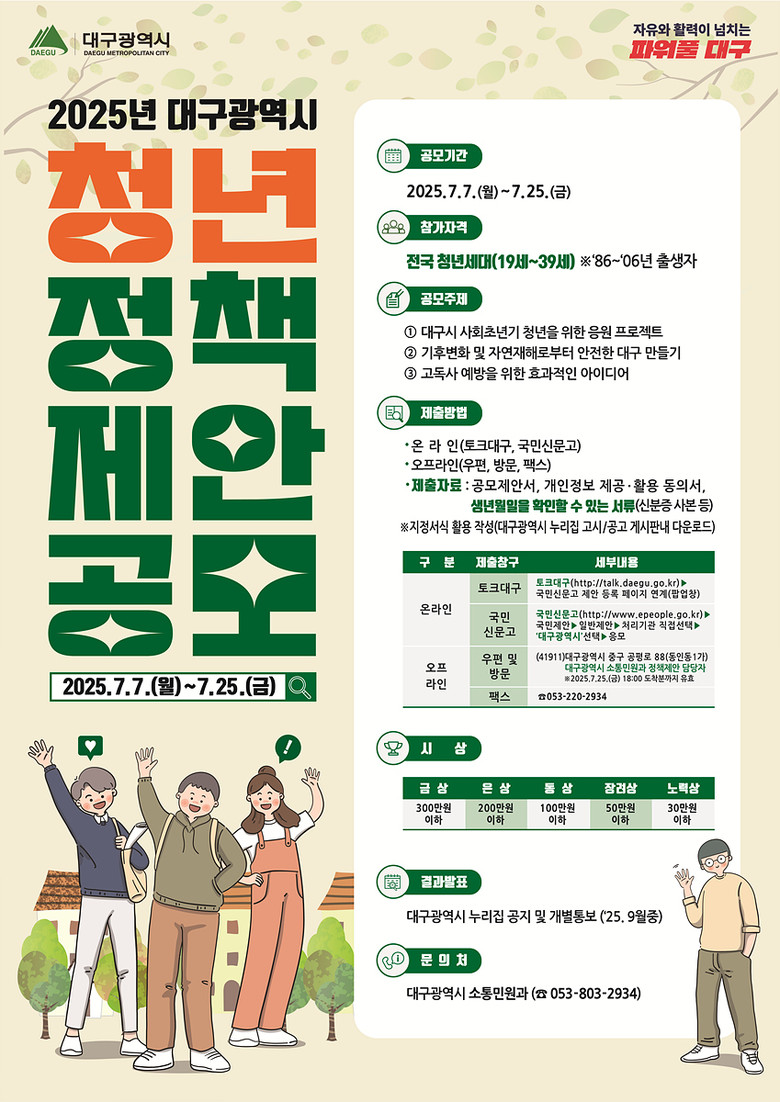 접수기간은 7월 7일(월)부터 7월 25일(금)까지 약 3주간이며, 대구시 온라인 참여 플랫폼 ‘토크대구’, 국민신문고, 우편, 방문, 팩스 등 다양한 방법으로 제안할 수 있다. 자세한 내용은 대구시청 홈페이지에서 확인 가능하다.