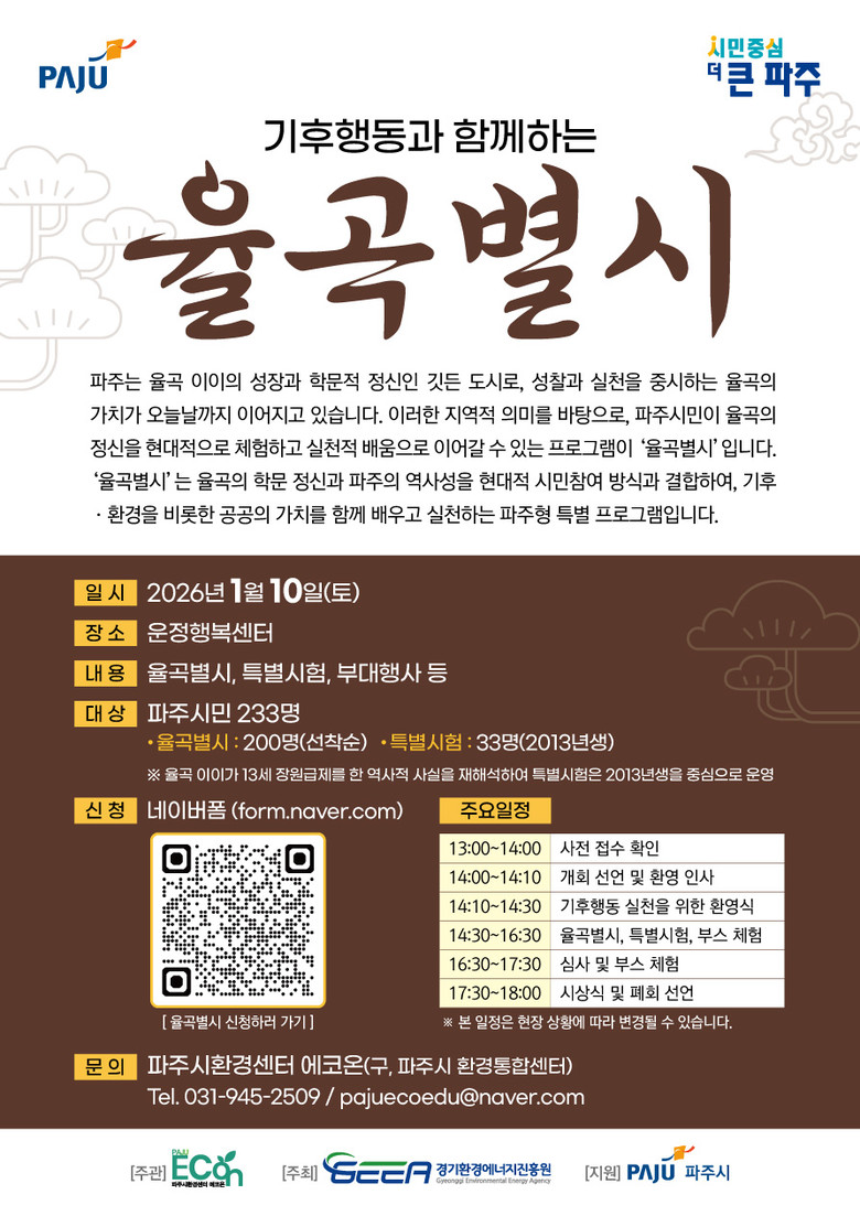 - 1월 10일 개최 앞두고, 시민 참가자 200명, 13세 특별시험 응시자 33명 선착순 모집 [파주시 세계타임즈=송민수 기자] 파주시환경센터 ‘에코온’은 파주를 대표하는 조선시대 사상가 율곡 이이의 학문 정신을 현대적 기후행동 가치로 재해석한 기후문화축제 ‘기후행동과 함께하는 율곡별시’를 오는 내년 1월 10일 운정행복센터에서 개최한다.