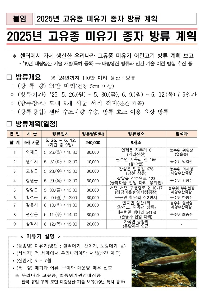 [강원도 세계타임즈=김민석 기자] 강원특별자치도(도지사 김진태)는 최근 환경변화와 서식지 파괴로 사라져 가는 고유어종 ‘미유기’ 자원 회복을 위해, 자체 생산한 어린 고기(전장 5cm 이상) 총 24만 마리를 5월 26일 인제군을 시작으로 6월 12일까지 9개 시군에 걸쳐 방류한다고 밝혔다.