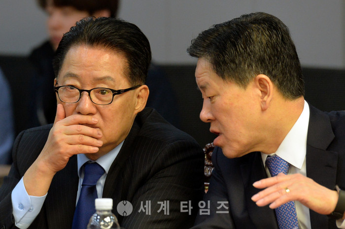 23일 오전 서울 여의도 국회 의원회관 제2세미나실에서 열린 국민의당 제12차 정책강화 국회의원 워크숍에 참석한 박지원(왼쪽) 대표가 주승용 원내대표와 대화하고 있다. 2017.02.23.