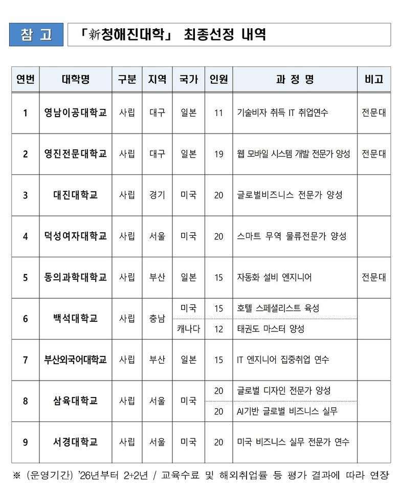 특히 올해부터 추진되는 ‘新청해진 대학사업’은 기존의 교육 위주 프로그램에서 벗어나 직무·산업 중심의 ‘해외취업 연계형’으로 개편돼 글로벌 기업 취업으로 이어지는 실질적인 취업 성과 창출에 초점을 두고 있다.