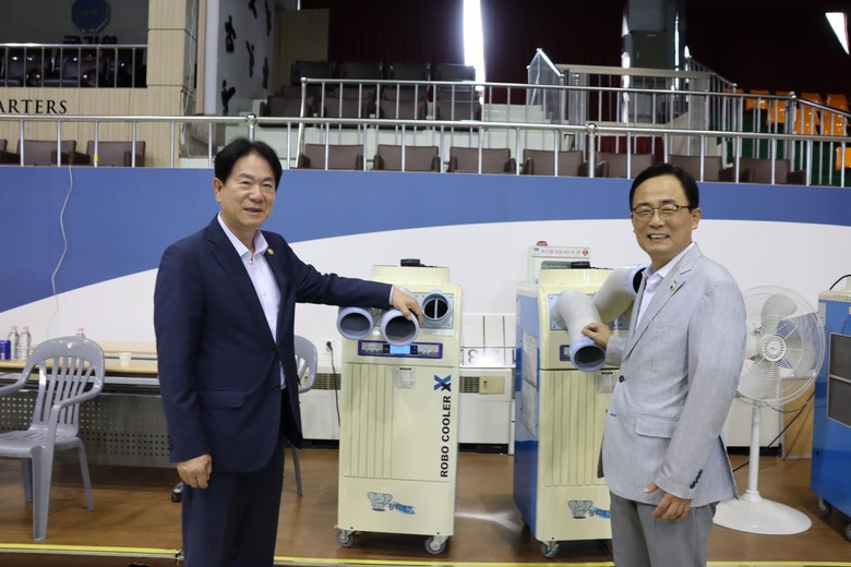 | ▲ 김형재 시의원이 국기원 중앙수련장에 설치 완료된 냉방기 (3층 벽면 위)를 배경으로 기념촬영을 하고 있다. |