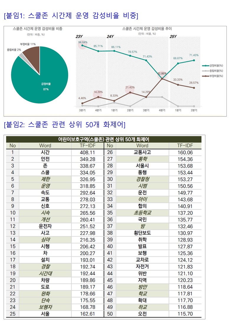 윤영희 서울시의원(국민의힘, 비례대표)이 ㈜골든플래닛에 의뢰해 온라인 커뮤니티 여론을 분석한 결과, 스쿨존 시간제 운영에 대한 긍정 의견이 87%에 달해 시민들의 압도적 찬성 여론이 형성된 것으로 나타났다. 이번 결과는 현행 규제가 시민들의 실생활에 미치는 불편이 상당하며, 안전성과 효율성을 동시에 고려한 제도 개선이 시급함을 보여줬다. [붙임1]