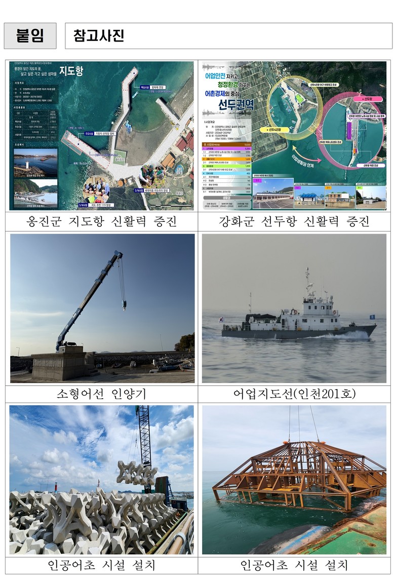어업인의 생명과 재산을 보호하기 위한 어항 안전 인프라 구축에도 집중한다. 인천시는 36억 원을 투입해 지방어항 건설 및 보수·보강 사업을 추진하고, 강화군 장곳항 방파제 증고와 소연평항 준설 설계 등을 통해 어항 기능을 강화한다.
