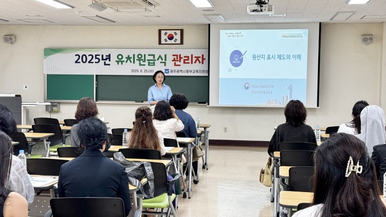 25일 교육은 관내 공·사립 유치원장을 대상으로 ▲올바른 농・축수산물 원산지 표시제의 이해 ▲저탄・소친환경 식단으로 건강한 유치원 만들기 ▲유치원급식 위생관리 방안 ▲청렴교육 등 유치원 급식의 특수성을 반영한 내용으로 진행됐다.