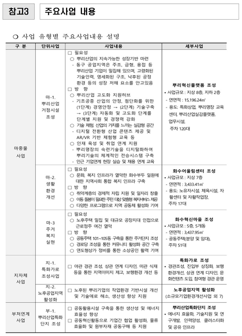 이와 함께 지자체 사업으로 특화가로 조성과 공업지역활성화 사업을 추진하고, 부처 연계 사업인 뿌리산업특화단지 조성도 병행하여 사업의 완성도를 높인다.