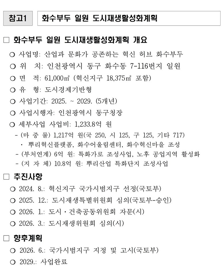화수부두 일원 도시재생사업은 국토교통부가 주관한 2024년 혁신지구 국가시범지구 공모에 선정(도시경제기반형)된데 이어 지난 2025년 12월 국토교통부 도시재생특별위원회 심의를 통해 국가지원 사항이 최종 확정됐다.