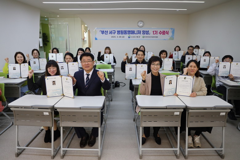 [서구 세계타임즈=이용우 기자] 부산 서구(구청장 공한수)는 지난 3월 24일부터 28일까지 5일간 총 40시간의 과정으로 진행한 「병원 동행 매니저 양성 교육」 1기 수료식을 개최하였다.