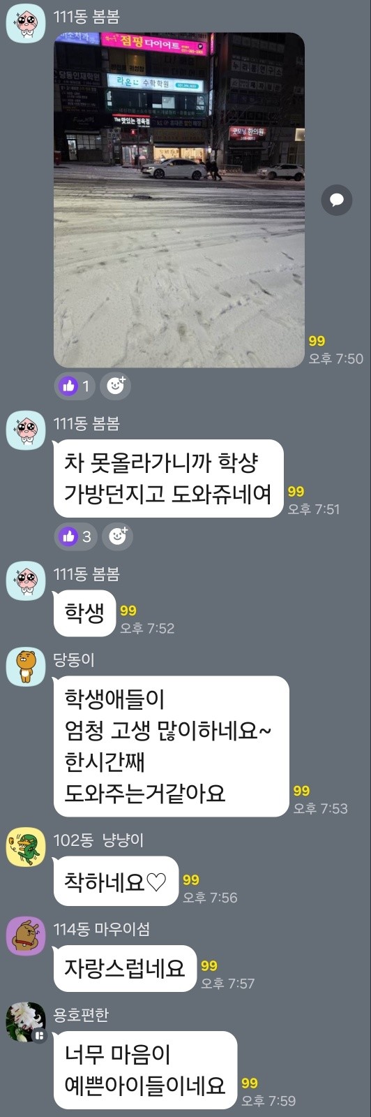 추운 날씨 속 얼어붙은 도로를 미끄러지며 밟았던 이름 모를 학생들의 용기있는 한 발 짝이 어쩌면 우리 사회가 더 나아질 수 있음을 보여주는 작은 희망이었으며, 그 따뜻한 마음이 길 위에 남아 시민들에게도 오래도록 전달되길 기대한다.