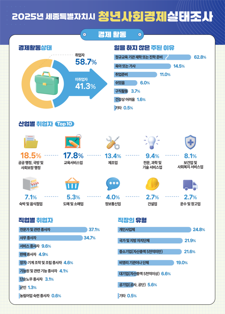 청년의 경제활동상태는 취업자 58.7%, 미취업자 41.3%였고 미취업 이유는 ‘정규교육 기관 재학 또는 진학준비’ 62.8%, ‘육아 또는 가사’ 14.5%, ‘취업준비’ 11.0% 등 순으로 집계됐다.