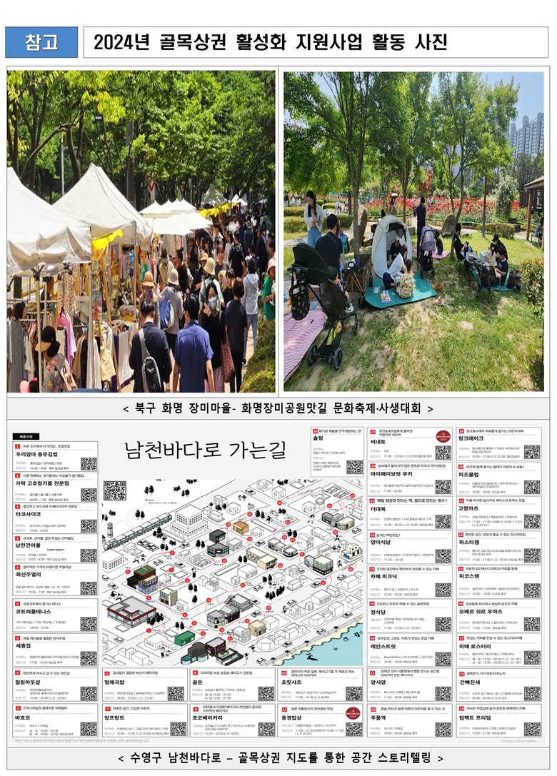 부산다운 골목도움 사업 선정에 따라 단순 골목 방문을 넘어, 더욱 긴 체류를 유도하기 위해 ▲계절별 마켓 운영 ▲도장(스탬프) 투어 이벤트 ▲남천바다로의 스토리를 담은 자료 보관(아카이빙)을 진행할 예정이다.