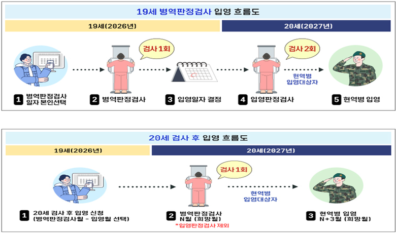 2026년에 19세가 되는 2007년생은 「19세 병역판정검사 일자 및 장소 본인선택」 또는 「20세 검사 후 입영」 제도 중 하나를 선택해 신청할 수 있다.