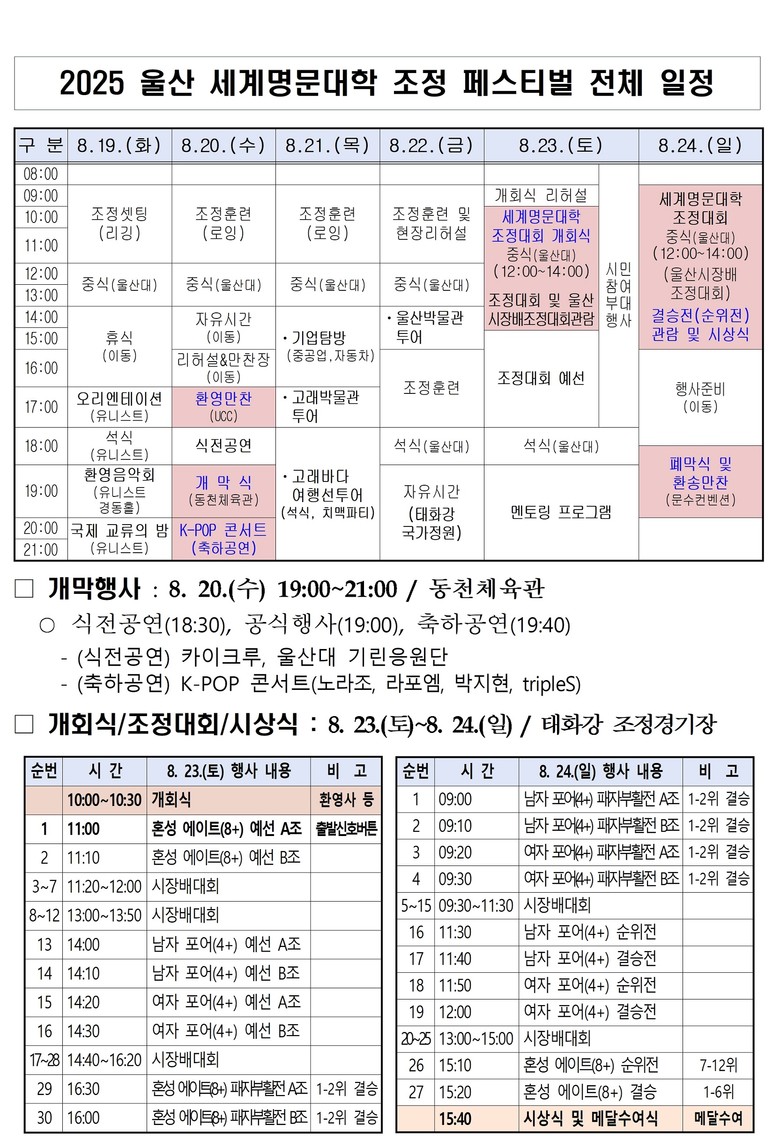 아울러, 23일과 24일 경기 기간 동안 태화강 행사장 일원에서는 세계 명문대학 홍보관과 시민 조정 체험 구역(존) 등도 함께 운영된다.