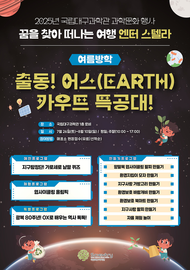 이난희 국립대구과학관 관장은 “여름방학을 맞이해 과학관을 방문하는 관람객들에게 다양한 과학체험 행사와 문화예술 공연 제공을 통해 지역민들의 과학문화 여가 조성에 기여할 수 있도록 노력하겠다”고 말했다.
